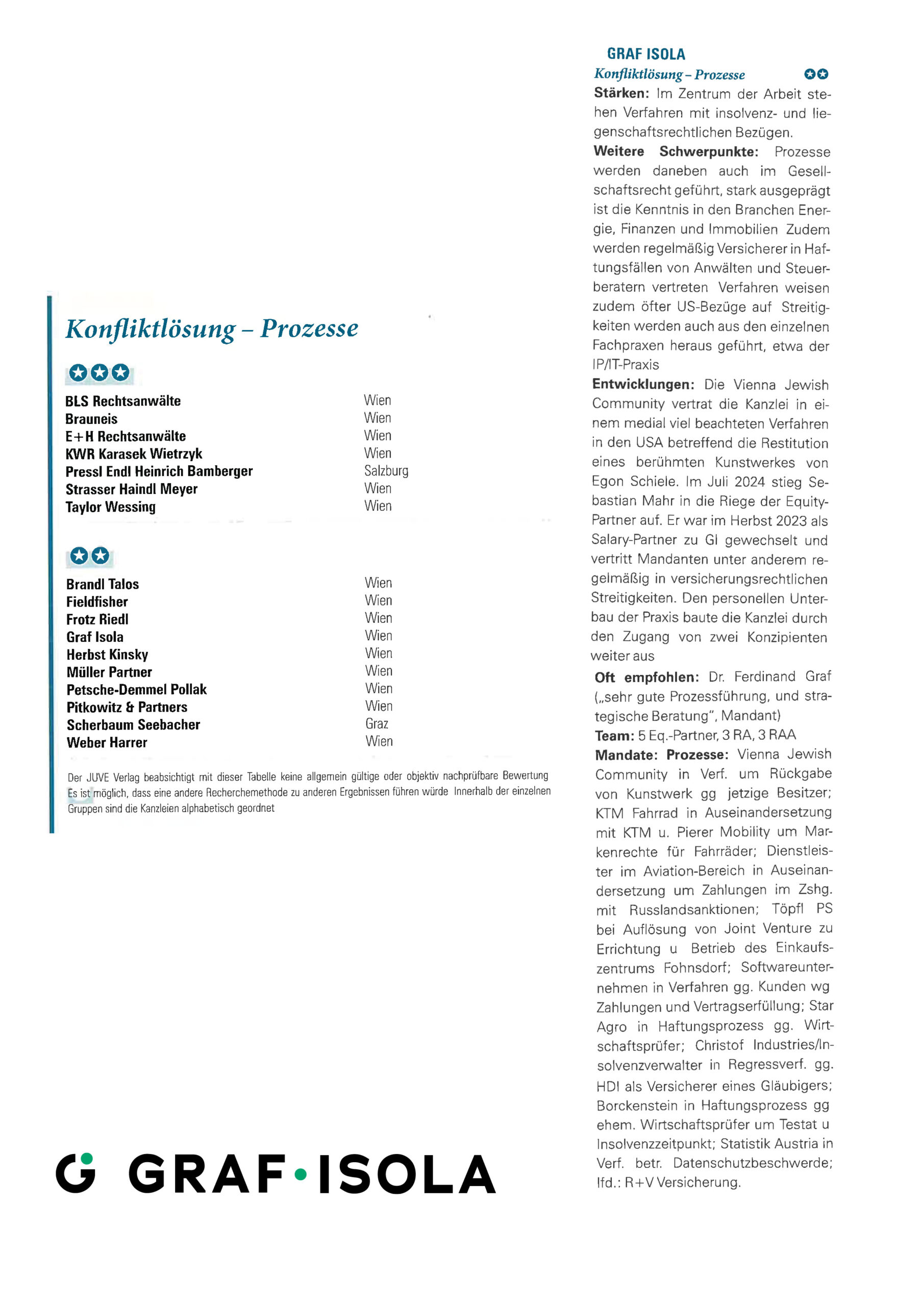Wir freuen uns über die erneute Nennung von Graf Isola im Anwaltsranking für Konfliktlösung unter den führenden Kanzleien. Hervorgehoben wurde unsere Expertise in komplexen insolvenz-, gesellschafts- und versicherungsrechtlichen Streitigkeiten in internationalen Verfahren. Wir gratulieren den genannten Dr.Ferdinand Graf, der als „sehr guter Prozessführer und strategischer Berater“ empfohlen wird, und Sebastian Mahr.